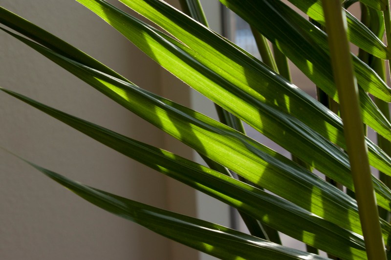 Palms near the windows in the Knowledge Center with sun shining through their leaves.