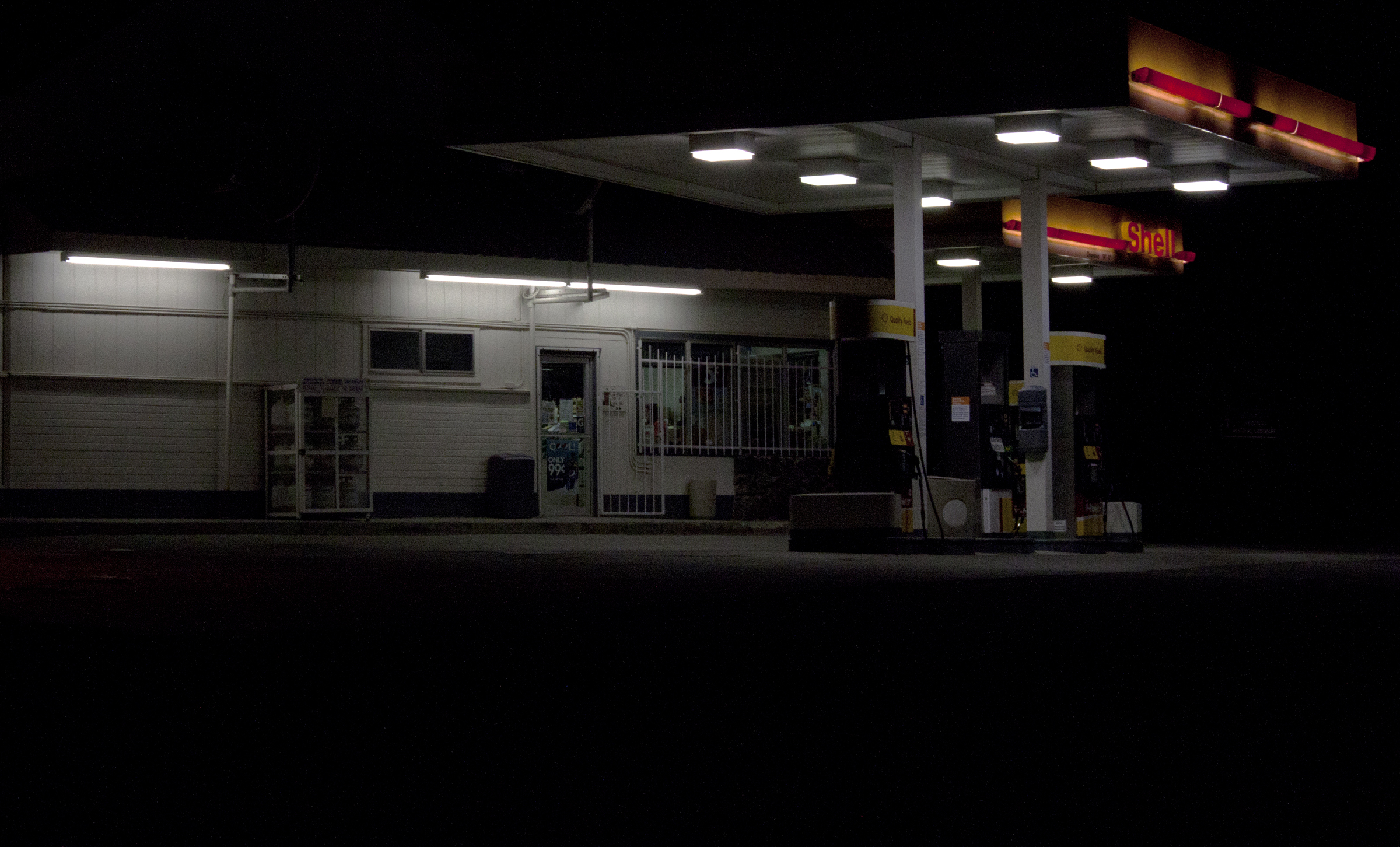 This gas station sits at the crossroads of Highways 50 and 95, the location of our town’s one and only stoplight; a blinking one. Shot at ISO 1600, f/13, 1/60s (hand-held).